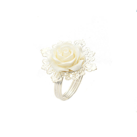 Table Linens: 6PC White Rose & Silver Filigree Napkin Rings