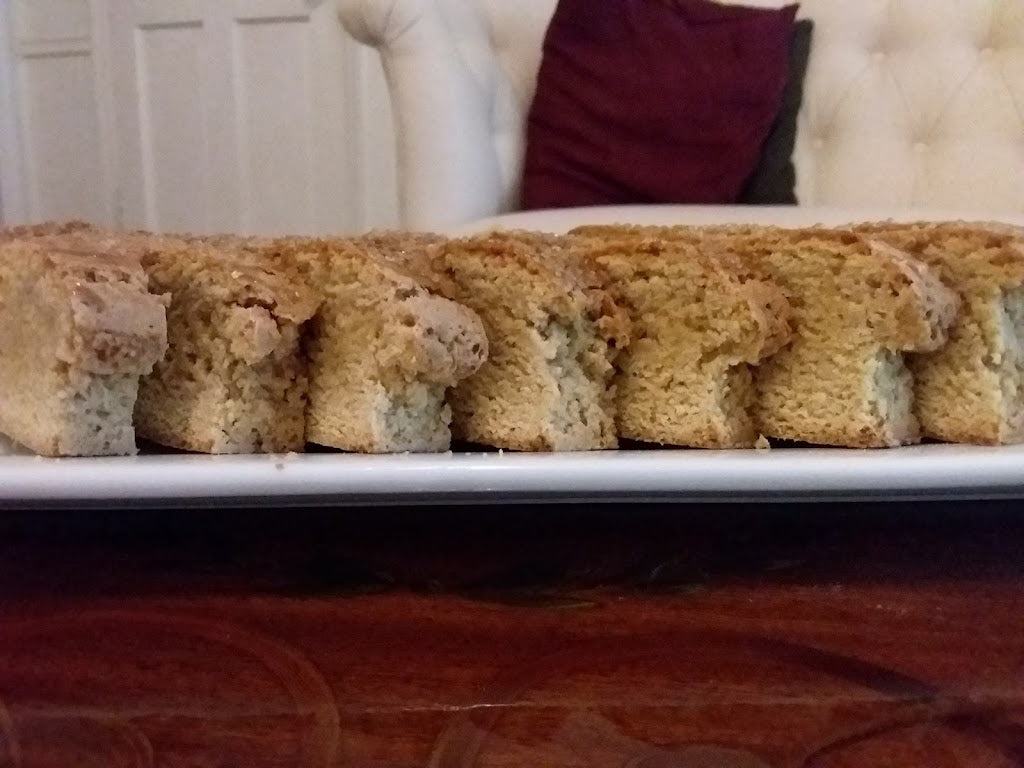 STEP 7: TWICE BAKE - Using a serrated knife, cut each piece into 1-inch-wide slices. Place slices back on the baking sheet cut-side down. Bake for another 10-20 minutes, depending on how dry you like it. The more it bakes it also gets harder.