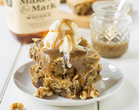 Serve with a scoop of ice cream or whipped cream on top + caramel bourbon sauce.,