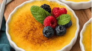 Sift 1 tbsp of sugar evenly on top of each creme brulée. Put each creme brulée on a turntable one by one and torch while turning to evenly caramelize the sugar on top.