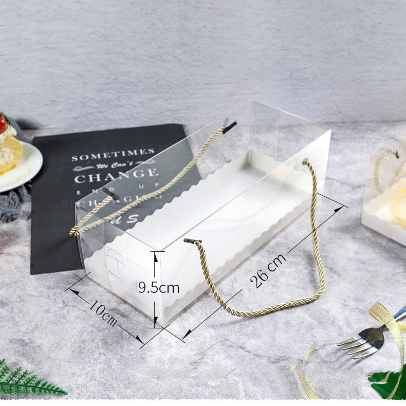 Rectangular clear plastic cake roll box with cardboard bottom adn rope handle for carrying.
