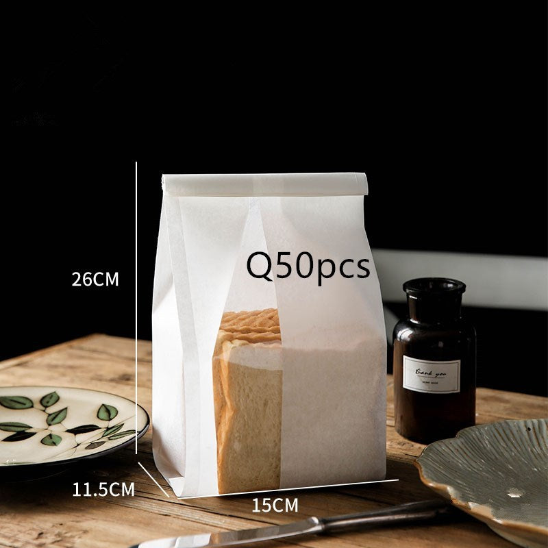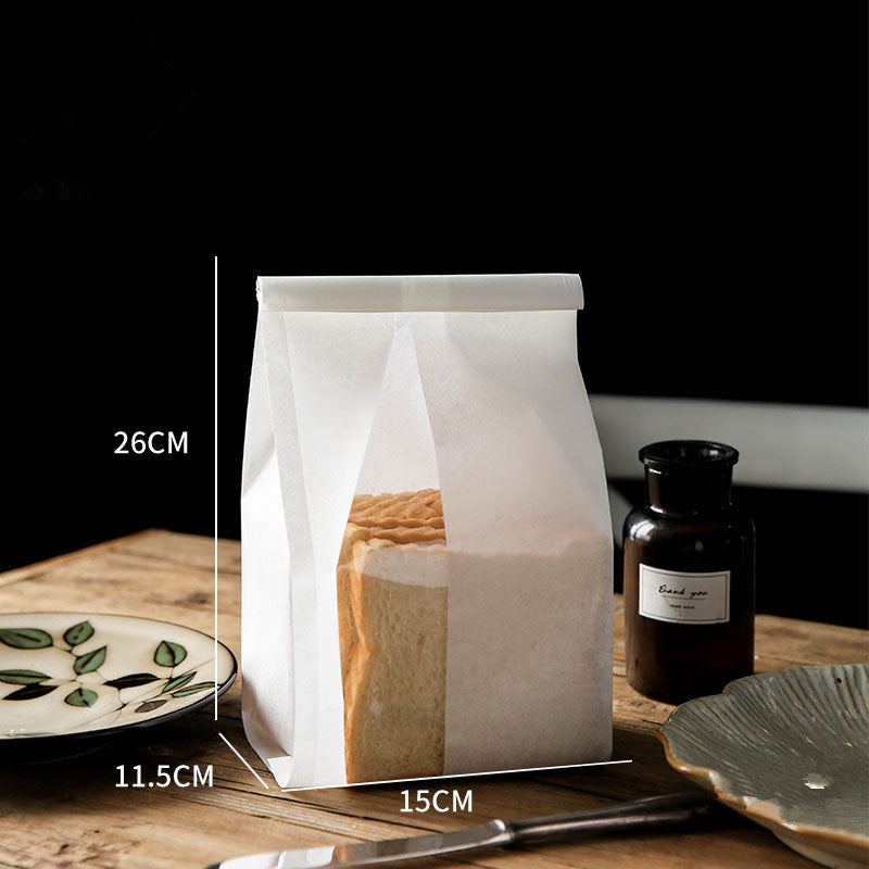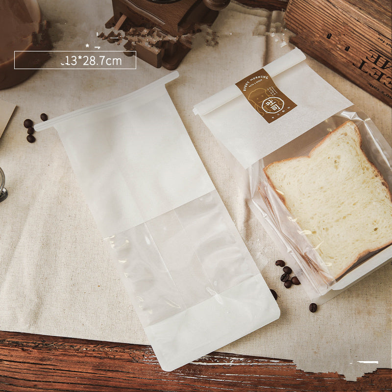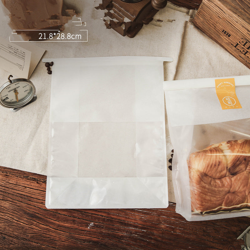 Lovely translucent bakery bags with clear plastic windows. Seals at the top with wire top edge to curl the edge over and seal it.