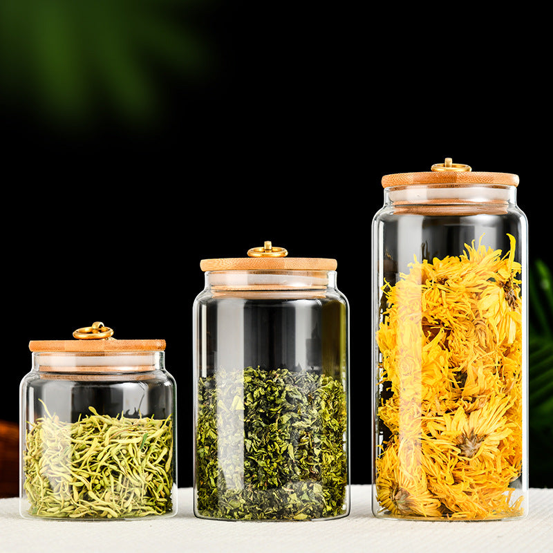 This airtight glass jar has a wooden lid and a touch of elegance with the delicate crystal knob on top or a Golden Pull Ring.. It really adds a touch of elegance.