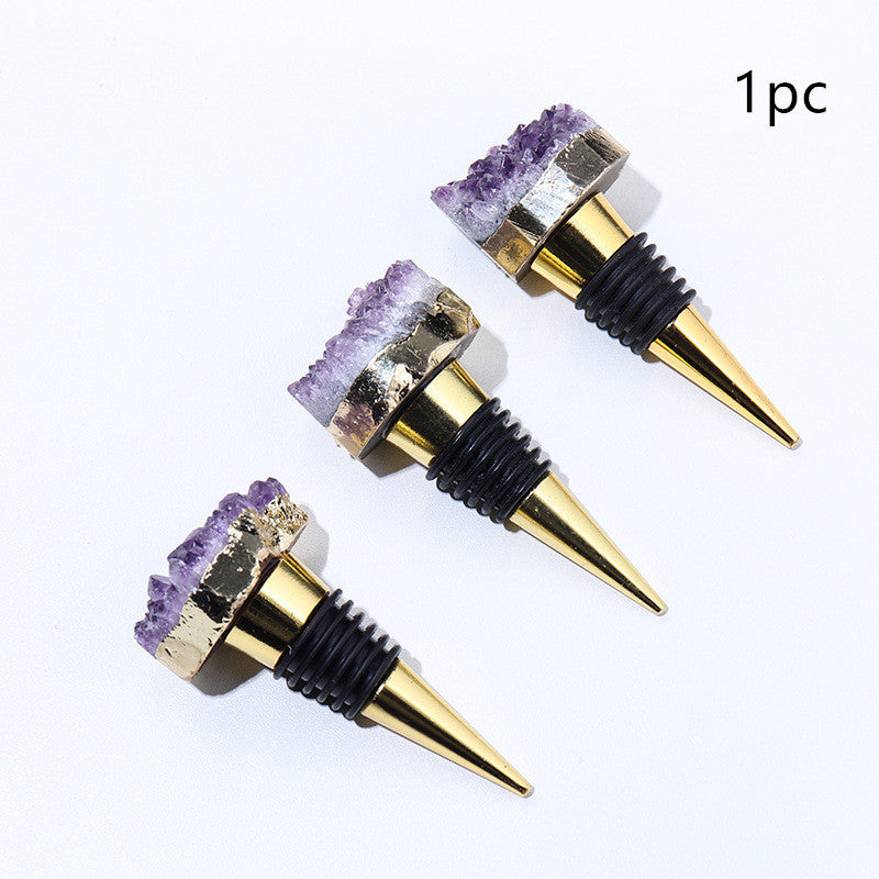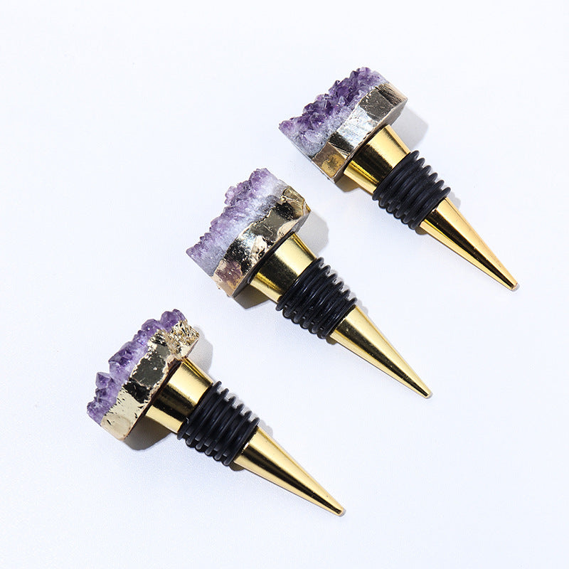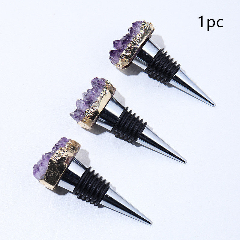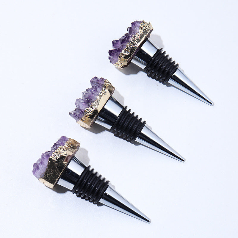 Crafted with stainless steel and crowned with natural amethyst cluster crystal, this wine bottle stopper is both functional and elegant. Choose from silver or gold for a touch of luxury to your wine collection. Keep your wine fresh and visually stunning with this unique stopper.