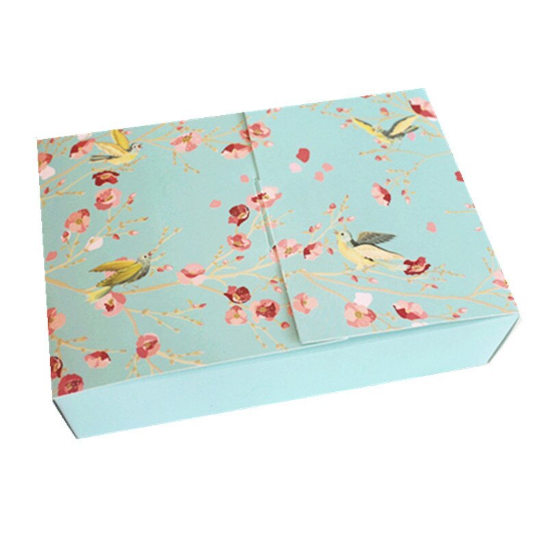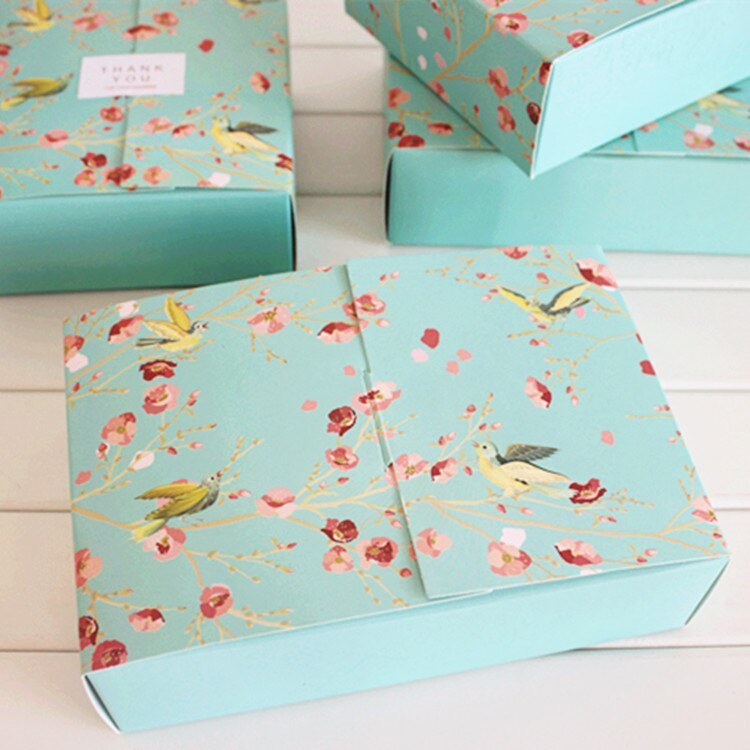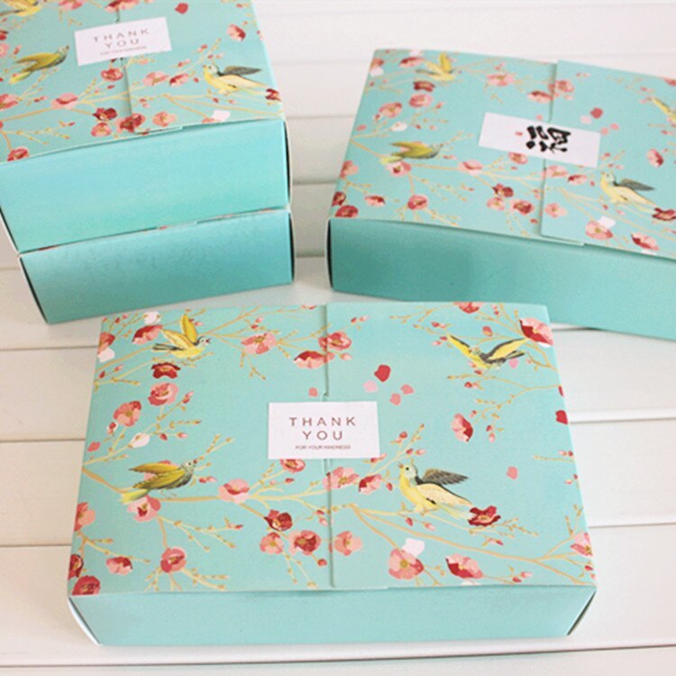 Beautifully printed birds and cherry blossoms on this aqua box. Perfect for shallow baked goods like brownies, blondies, bars, thin cake slices, fudge, chocolate, marzipan fruits, cornes de gazelle, icebox cookies and more. Food grade bakery paper.