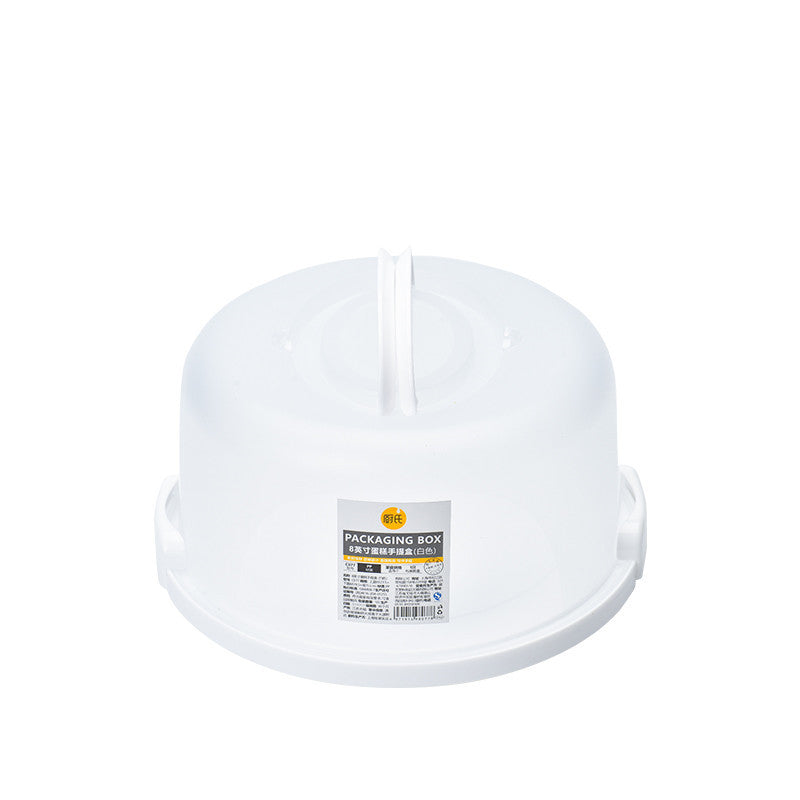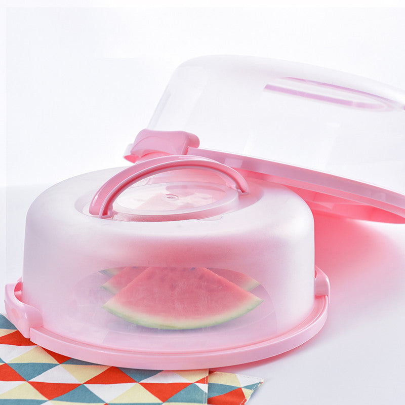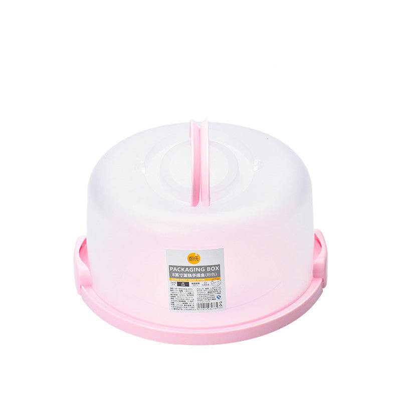 This cake carrier has a translucent cover with a white or a pink base and carrying handle. The outer diameter of 9"-11" holds an 8" diameter cake.