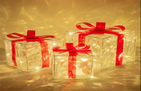 Color: 3-piece set of large, medium and small gift box (red, blue and green),3-piece set of white gold onion warm white light gift box, 3-piece set of color Iris gift box, 3-piece set of PVC laser piece warm white light gift box, PVC printing snowflake three-piece set of gift box