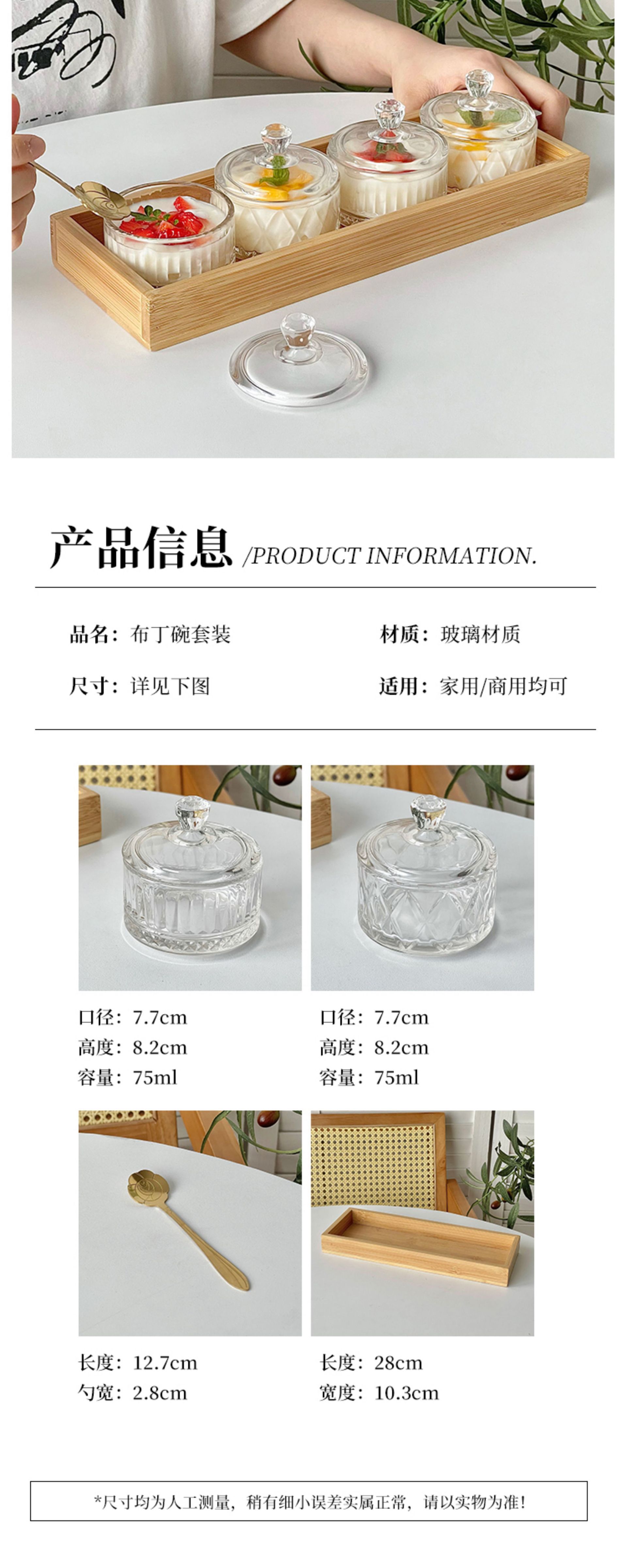 Experience elegance and sophistication with our Cut Glass Dessert Cup Set. This 4-piece set includes beautiful cut glass cups with lids, gold electroplated rose spoons, and a wooden serving tray. Serve your favorite desserts like mousse, tiramisu, and trifle in style with a touch of vintage charm. Each cup can hold up to 75ml and is made with single layer cut glass for a stunning presentation.