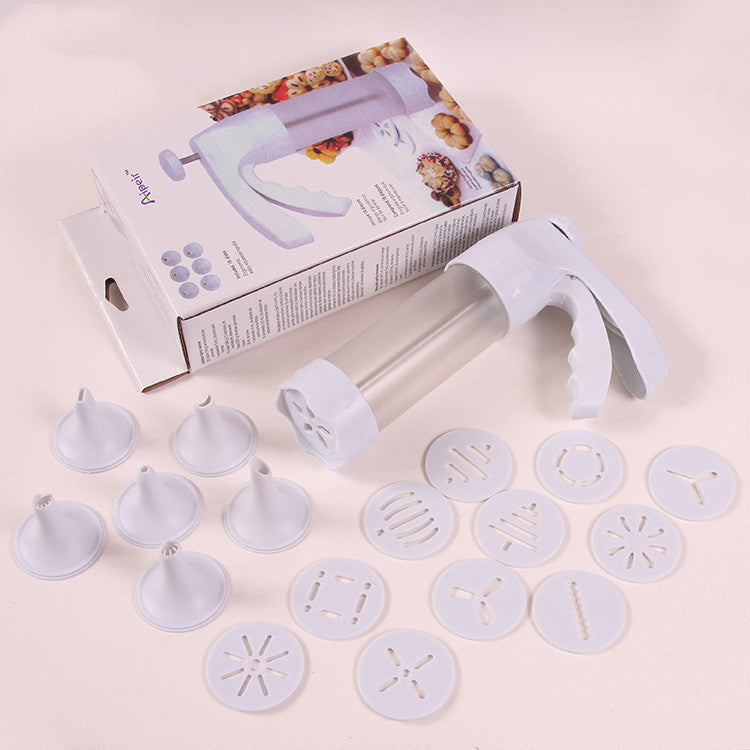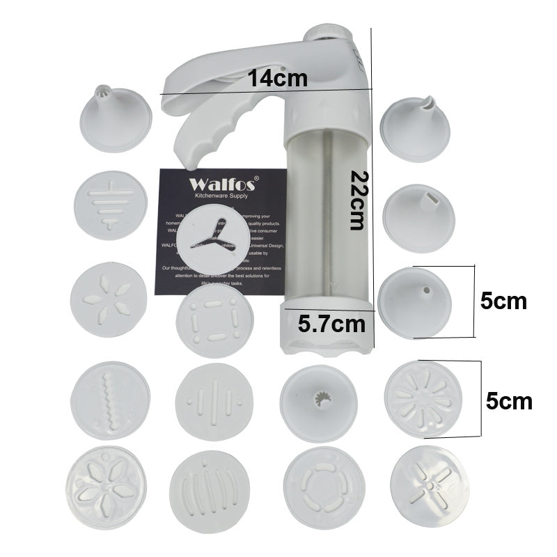Plastic cookie extruder is light weight and easy to clean. Clear cylinder lets you see how much cookie dough is left inside. Comes with 12 shape disc that makes a variety of cookies in the easiest way. NO sculpting, no molds, no cutters, or stand., Just squeeze and you're done!