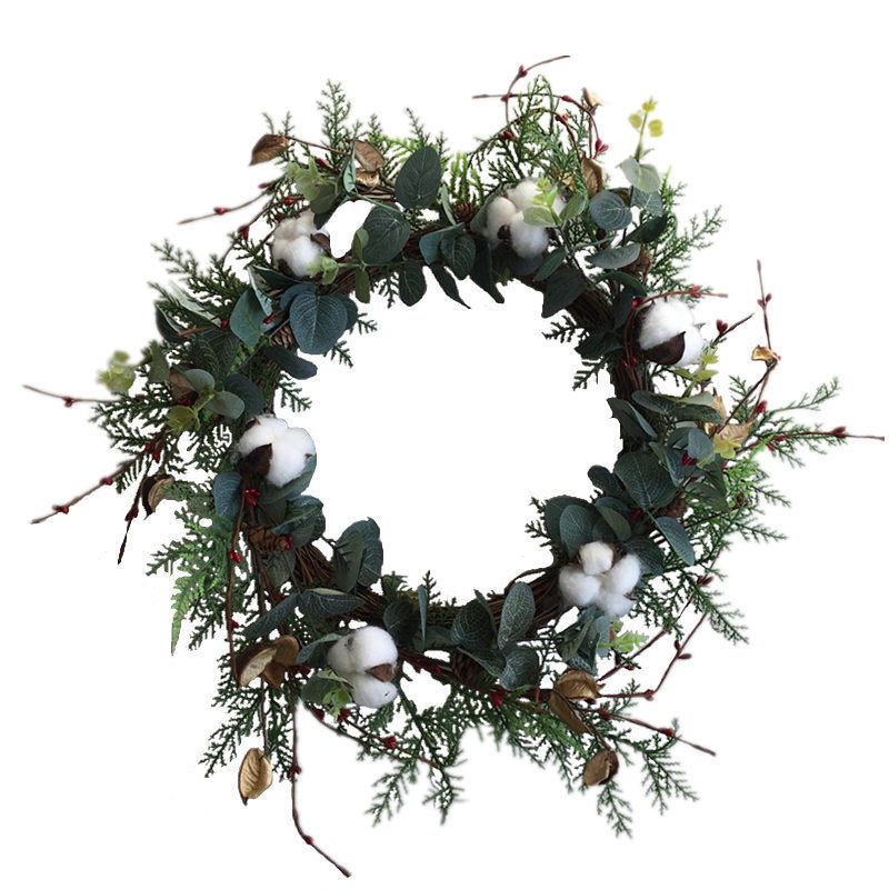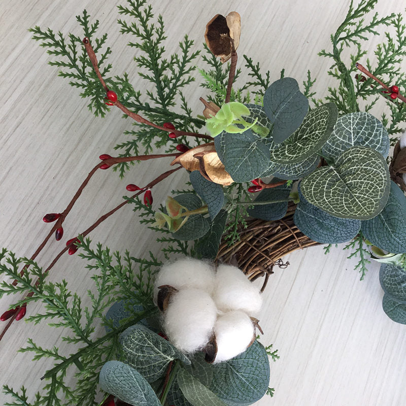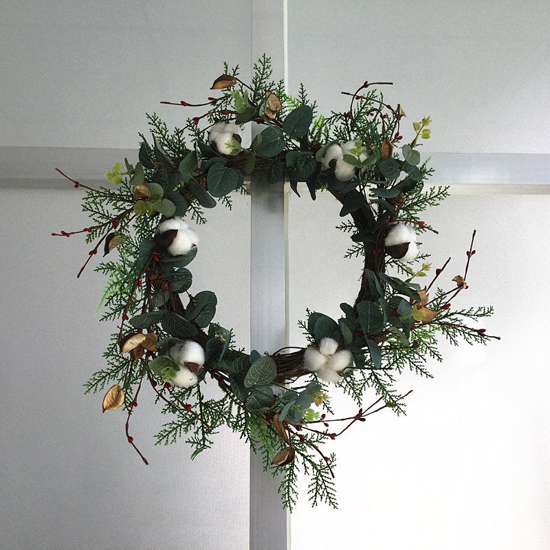 Crafted with natural dried plants and delicate cotton, our Christmas wreath adds a touch of woodland elegance to your home. Adorned with lush eucalyptus leaves, this wreath is perfect for adding a cozy touch and a warm welcome to any door, window, or fireplace.