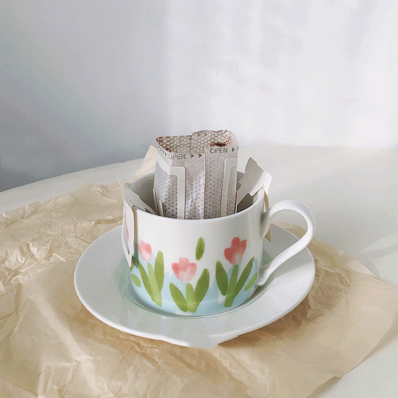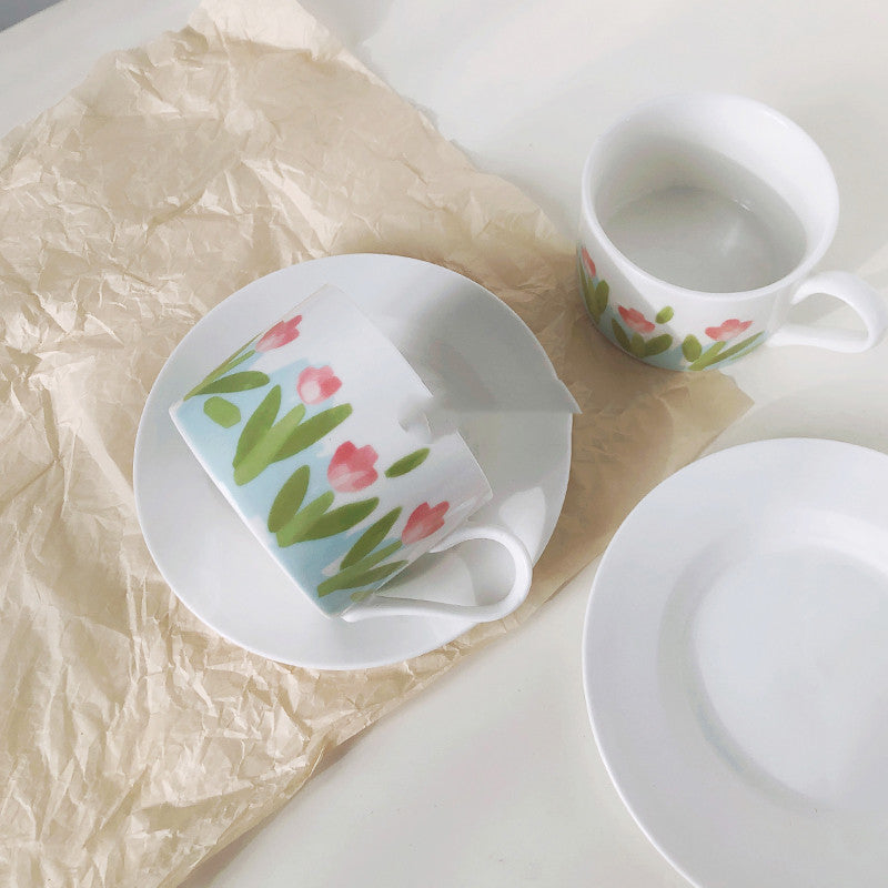 Indulge in a delicate and fresh French floral experience with the Coffee & Tea Tulip Cup & Saucer. Crafted from porcelain ceramic, this hand-painted gift set features vibrant flowers and leaves on the cup. The modern design is completed with a smooth white ceramic ball on the end of the spoon. Elevate your coffee or tea ritual with this elegant set. Flower tulip cup and saucer
