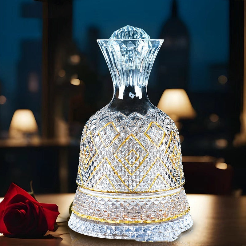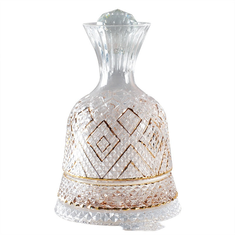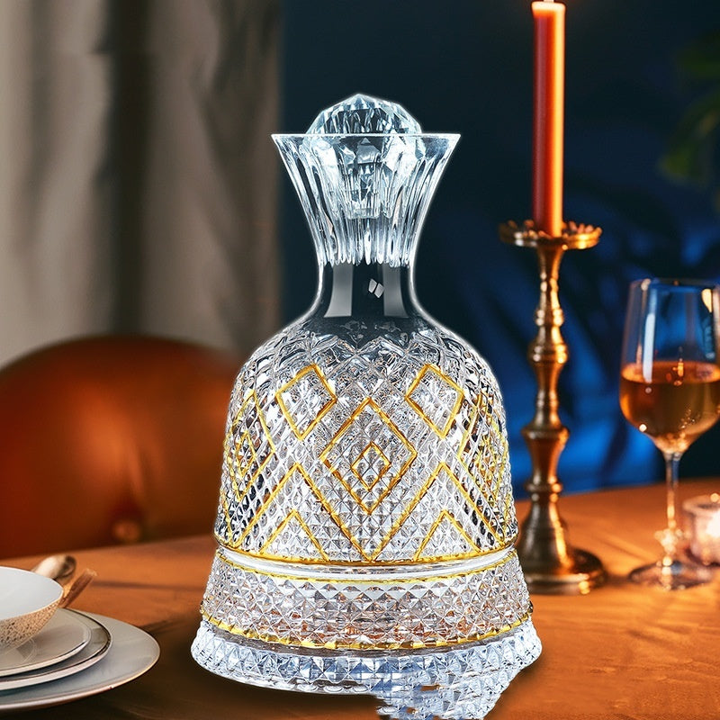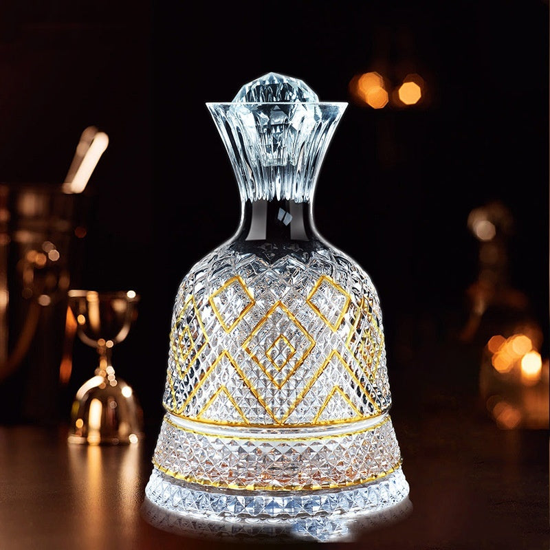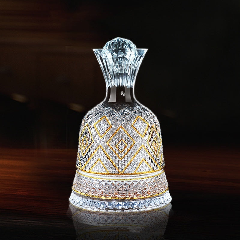 This Gold Crystal Bell Wine Decanter is crafted from lead-free gold crystal, providing a luxurious and elegant addition to your wine collection. With a generous 1,000ml capacity, it allows for proper aeration, enhancing the flavor and aroma of your wine. Elevate your wine experience with this exquisite decanter.