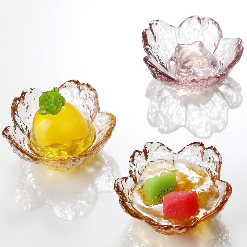 Expertly designed for a luxurious touch, the Gold Edged Glass Flower Petals Dish adds elegance to any dining experience. With a stunning hammer pattern and gold edging, this small glass serving bowl is perfect for desserts, condiments, fruits, candies, sauces, and toppings. Available in two styles - Sakura and Lotus - and in various quantities per set.