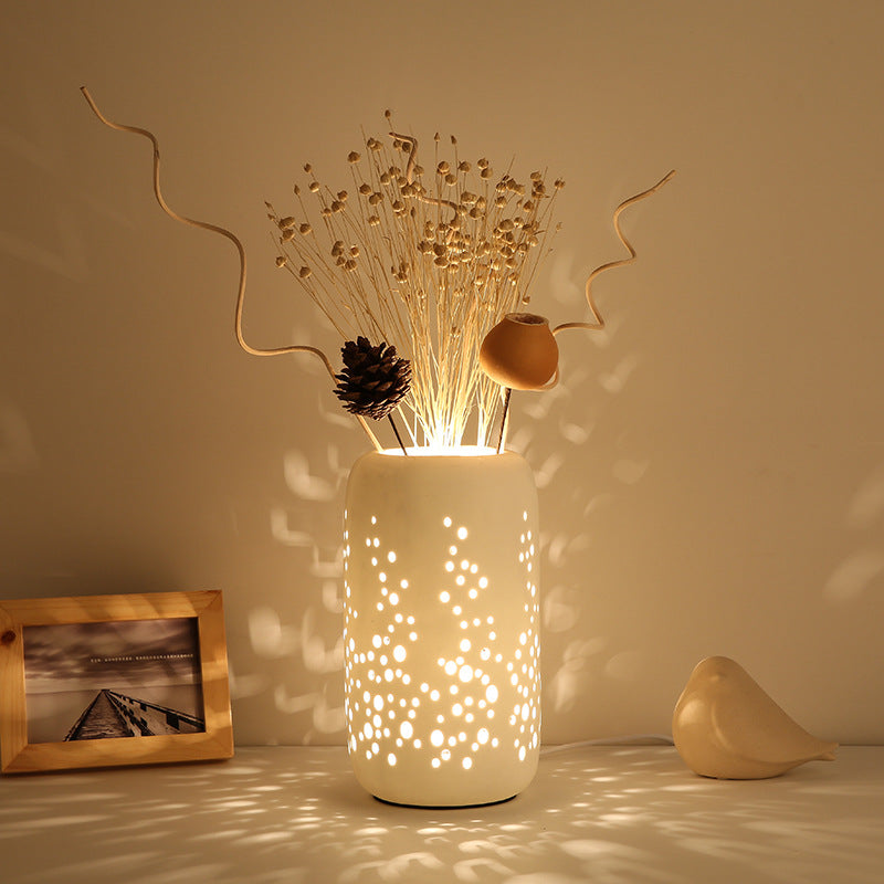 Illuminate your space with this stunning table lamp. The filigree design on the vase not only adds a touch of elegance, but also creates a unique dappled light pattern. Enjoy the natural style of dried botanicals displayed on top of the vase.