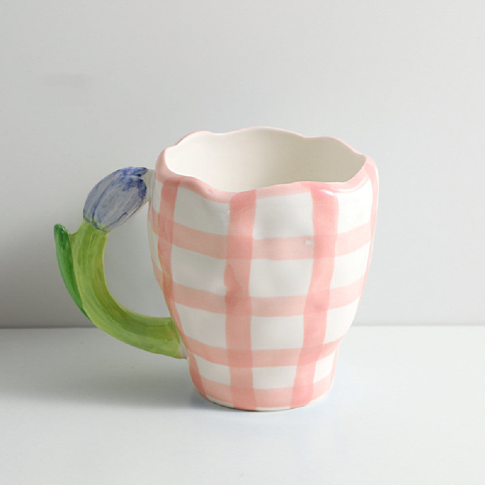 Crafted with artistic flair, our Pastel Gridline Mugs are made of high-quality porcelain ceramic for a durable and elegant piece. The unique tulip shape and delicate grid pattern in light blue or pink add a touch of sophistication, while the green flower stem handle provides a whimsical touch. Available in pink or blue, these mugs are the perfect addition to any kitchen.