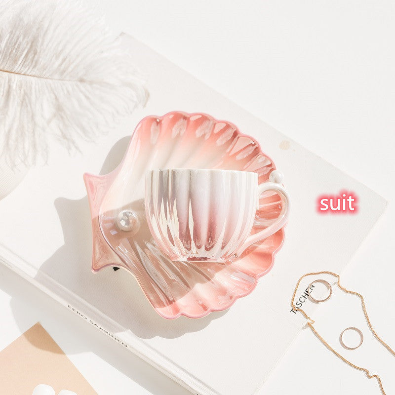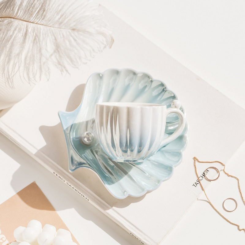 Elevate your coffee or tea experience with our Porcelain Pearl Seashell Cups. Crafted with precision, these cups come in enchanting pearly shades of peach, white, blue, pink, and lavender. The ribbed seashell design with a pearlized finish brings of the calm and delight of the sea. Each saucer has an actual pearl to make every sip feel luxurious.