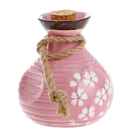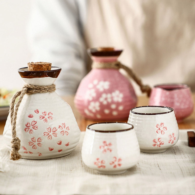 Japanese Sakura Container, Wine Jar with cork stopper and set of saki cups. Sakura in Japanese simply means Cherry Blossom. These beautiful ceramics are traditionally used for serving Japanese white rice wine known as saki.