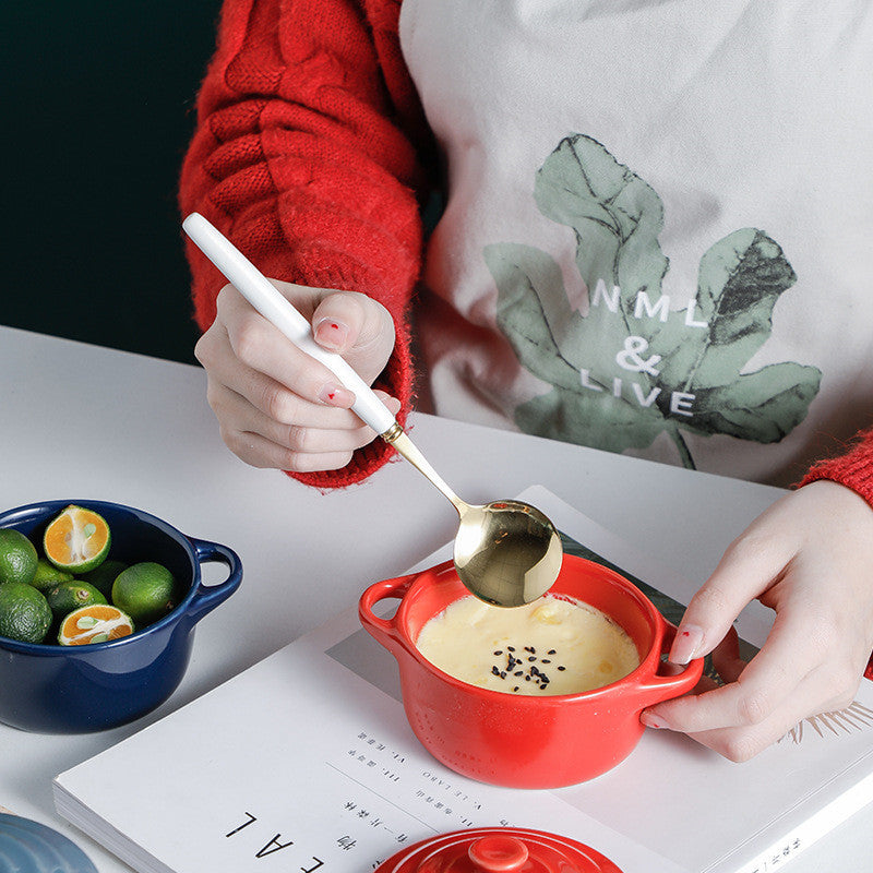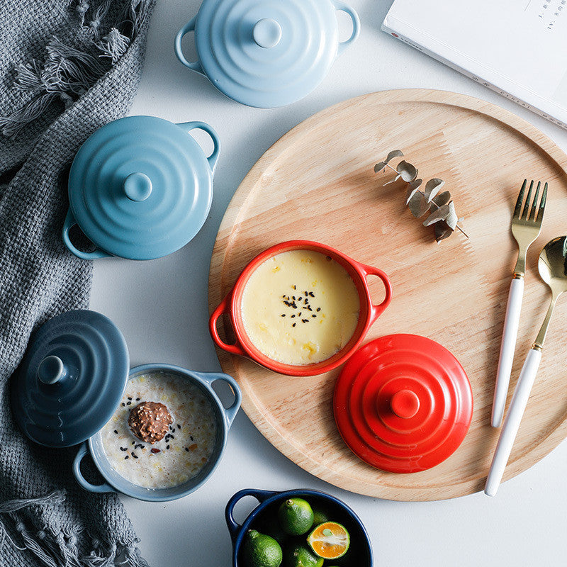 Single Serving Crockpot. Cute and stylish porcelain ceramic bowl with lid. by Binaural. Great for soup or cereal, oatmeal, eggs, or dinner leftovers. Use for baking souffles and casseroles. Super presentation for mousses to go! Colors: Blue, Light Blue, Red, White, and Black