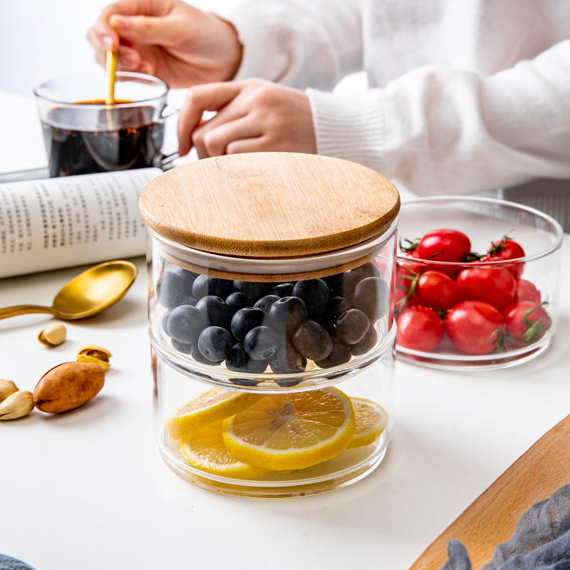 Efficiently store and organize your food with our stackable glass bowls. Made of heat resistant borosilicate glass, these bowls can be used for hot or cold items and even as a countertop display for snacks. The wooden lid doubles as a bowl, giving you flexible storage options.