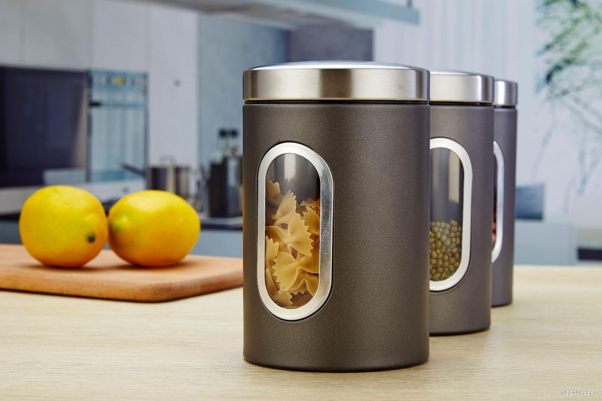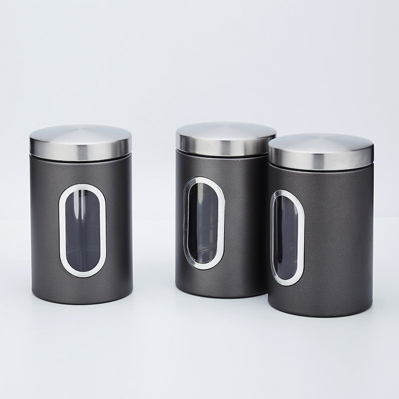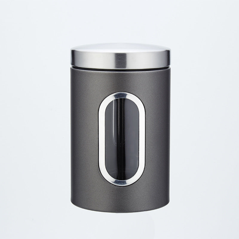 Attractive frosted grey metallic stainless steel with silver lid with an oval window so you can see what's inside. Beautiful on your kitchen counter. Great for nuts, candy, coffee, coffee beans, teas, pasta, dry beans, legumes, dried fruit