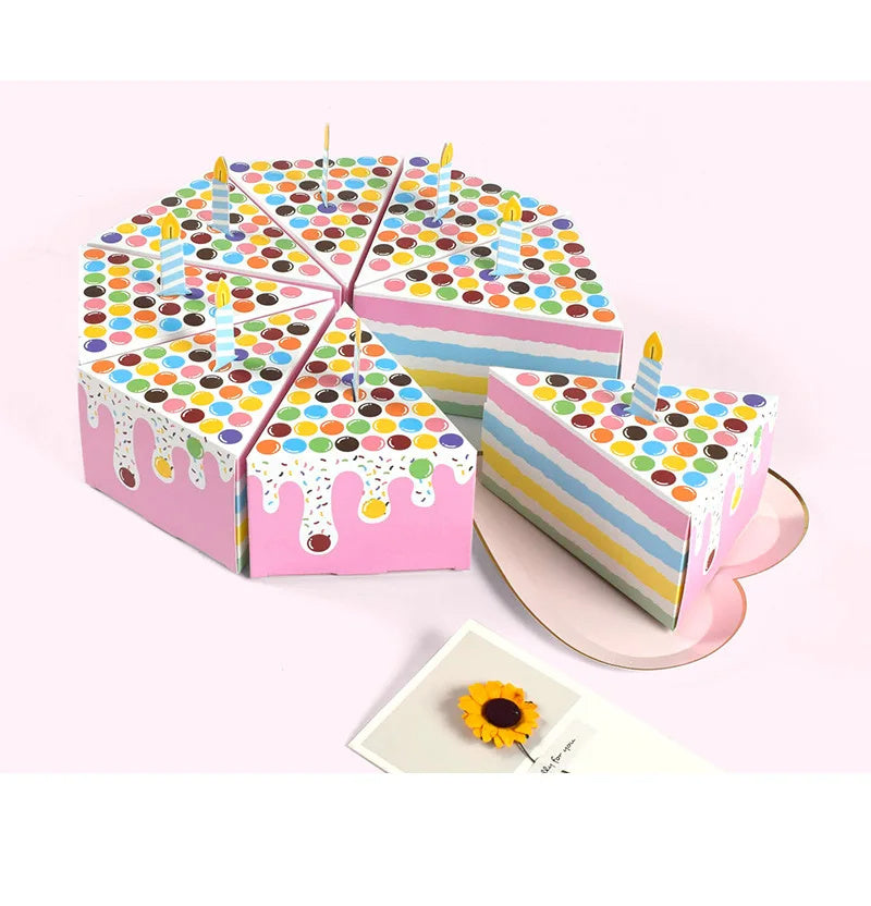 Pink with colorful polka dots. Fun triangle cake boxes. 8 triangles complete the circle of a while cake, pie, tart, or flan. What a cleaver way to carry a cake to a party - already cut servings! Slice your cake or pie into individual boxes and keep them in place as a cake or pie!