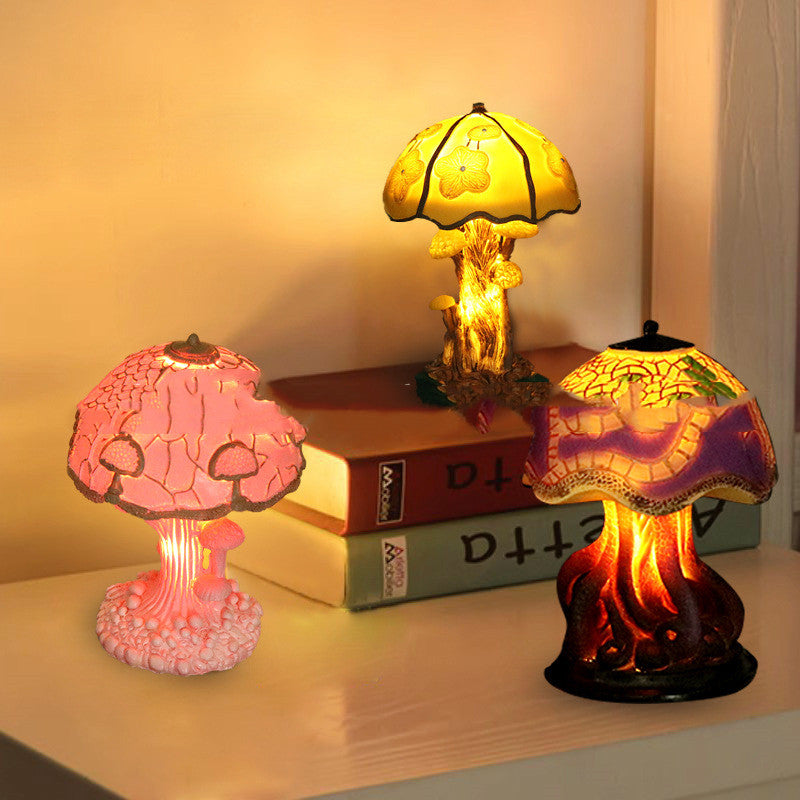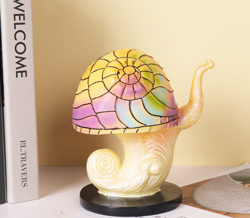 These colorful figurine table lamps are sure to add an artistic touch to any room. Featuring whimsical sculpted figures of mushrooms and snails, these lamps have a stained glass style made of resin for a vibrant and unique look. Brighten up your space with these colorful and creative table lamps.