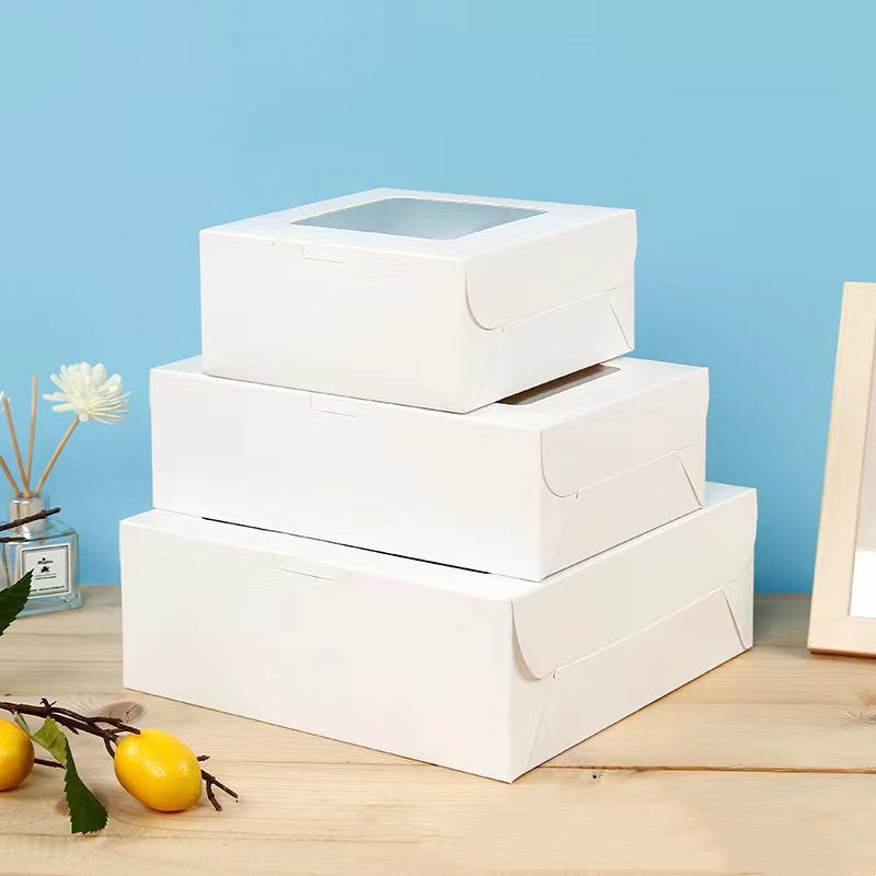 Are you looking for the basic bakery box? Here you are...plain white, sturdy paper/cardboard with a window on top. This is approx. 3" X 6" box, suitable for 1 slice of dessert or cookies, fudge, etc. It comes with a grid to keep cupcakes or tarts, or dessert cups steady.