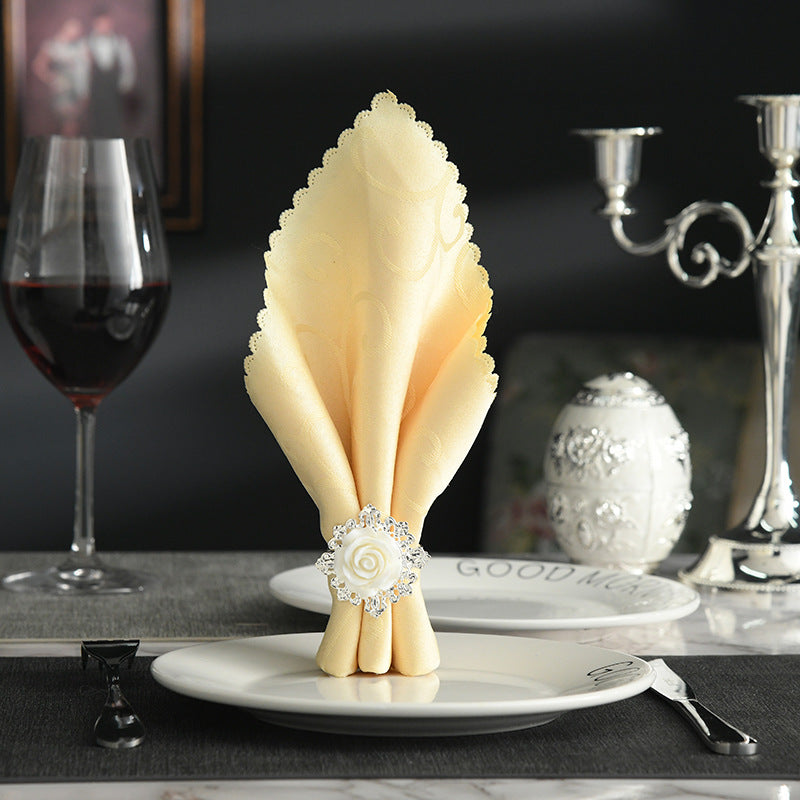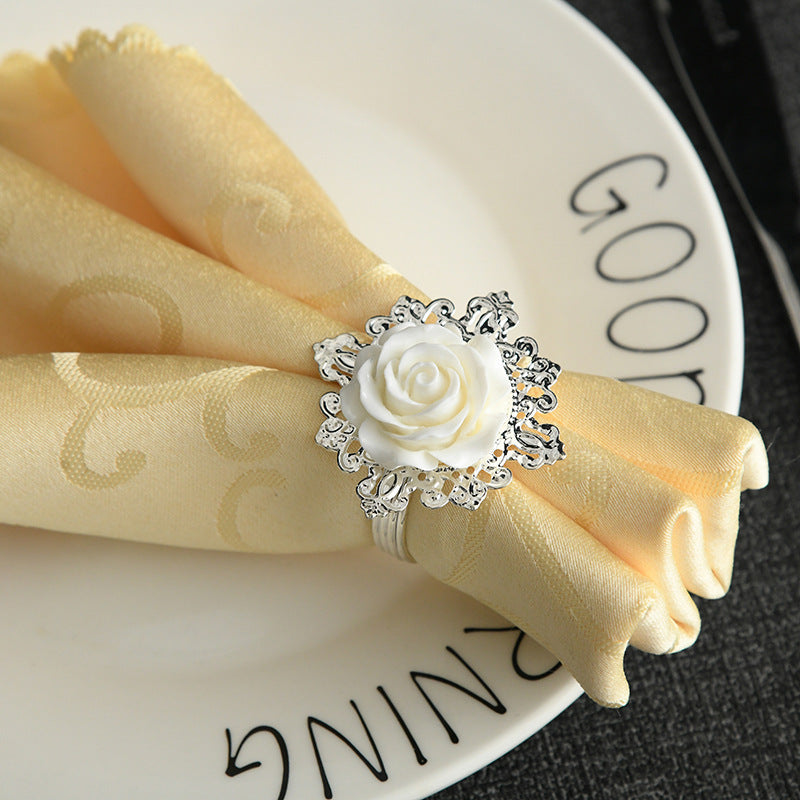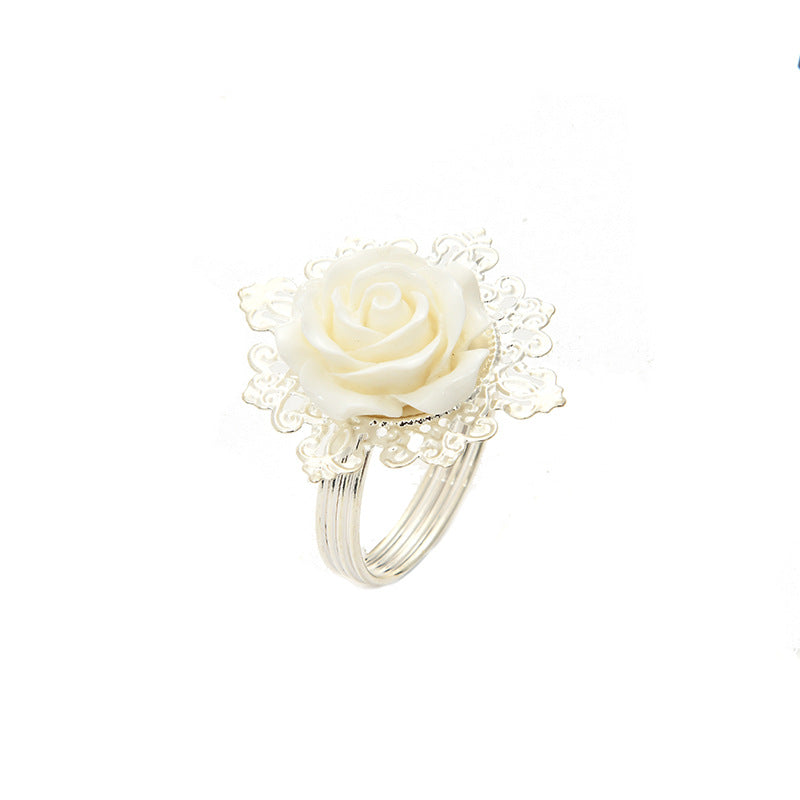 Table Linens: 6PC White Rose & Silver Filigree Napkin Rings